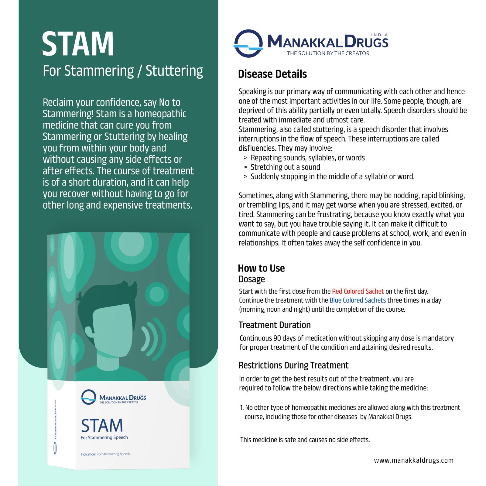Reclaim your confidence, say No to Stammering! Stam is a homeopathic medicine that can cure you from Stammering or Stuttering by healing you from within your body and without causing any side effects or after effects. The course of treatment is of a short duration, and it can help you recover without having to go for other long and expensive treatments.
